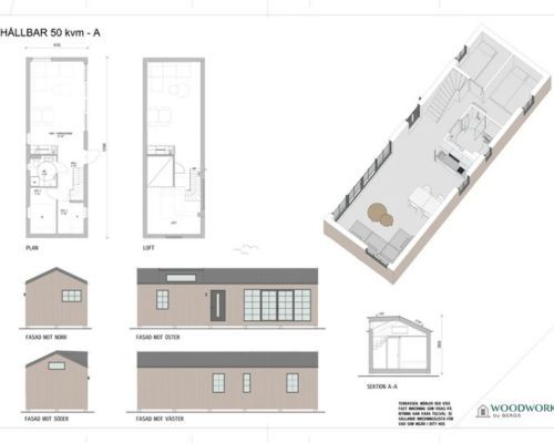 Das Modell Hållbar 50 ist ein in Schweden gefertigtes Fertighaus von Woodworks by Bergs mit einer Wohnfläche von 50 m², das skandinavisches Design mit funktionaler Raumaufteilung kombiniert. Die Fassade aus behandeltem Holz und die minimalistische Architektur machen dieses Haus ideal für moderne Familien oder als Zweitwohnsitz.