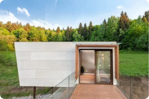 - Fassade: Hinterlüftete Zementfaserplatten + Thermoholzverkleidung (farblich wählbar)