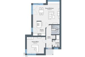 - Erdgeschoss: Büro, Gäste-WC, Eingangsbereich, Küche-Wohnzimmer-Esszimmer