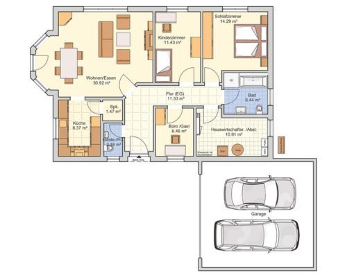 Wohn-/Essbereich mit offener Küche, Hauptschlafzimmer, Kinderzimmer, optional Büro oder Gästezimmer