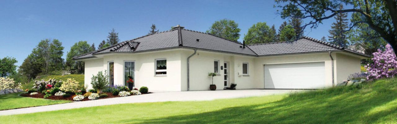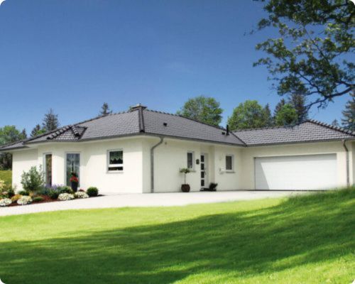 Helle Putzfassade, dunkles Dach, Erker und optional große Garage, barrierefrei konzipiert