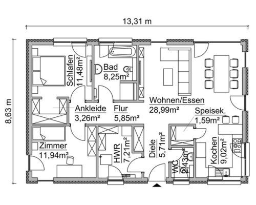 - Extras: Nischenlösungen für Garderobe/Stauraum, Hauswirtschaftsraum, bodentiefe Fenster