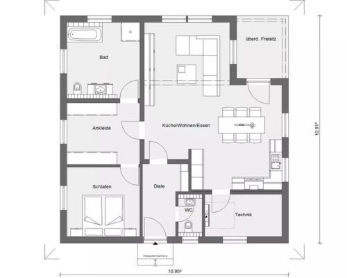 - Außenmaße: 10,96 m × 10,91 m