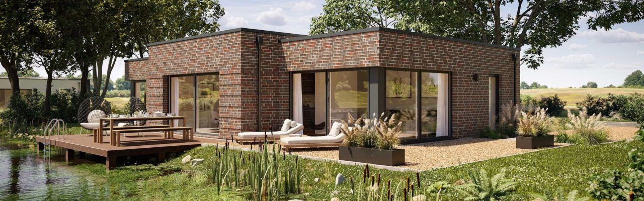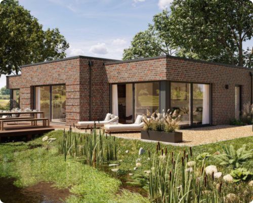Das Edition 300 B von Viebrockhaus ist ein Stein-Fertighaus im Bungalowstil, das durch seine elegante, klare Architektur und den zentralen Wohnbereich als Herzstück des Hauses hervorsticht. Mit einer Wohnfläche von über 130 m² auf nur einer Ebene kombiniert das Modell offene, lichtdurchflutete Räume mit geschützten Rückzugsorten und schafft so eine perfekte Balance zwischen Gemeinschaft und Privatsphäre.