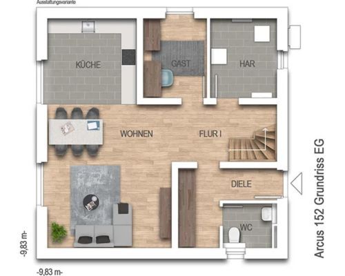 Die Stadtvilla Arcus 152 von Heinz von Heiden ist ein Stein-Fertighaus für Einfamilien mit zwei Vollgeschossen, konzipiert für Familien, die helle, großzügige und energieeffiziente Räume wünschen. Mit ihrem quadratischen Grundriss von 9,83 x 9,83 m bietet dieses Modell über 150 m² Wohnfläche, die in ausgewogene Räume aufgeteilt ist.